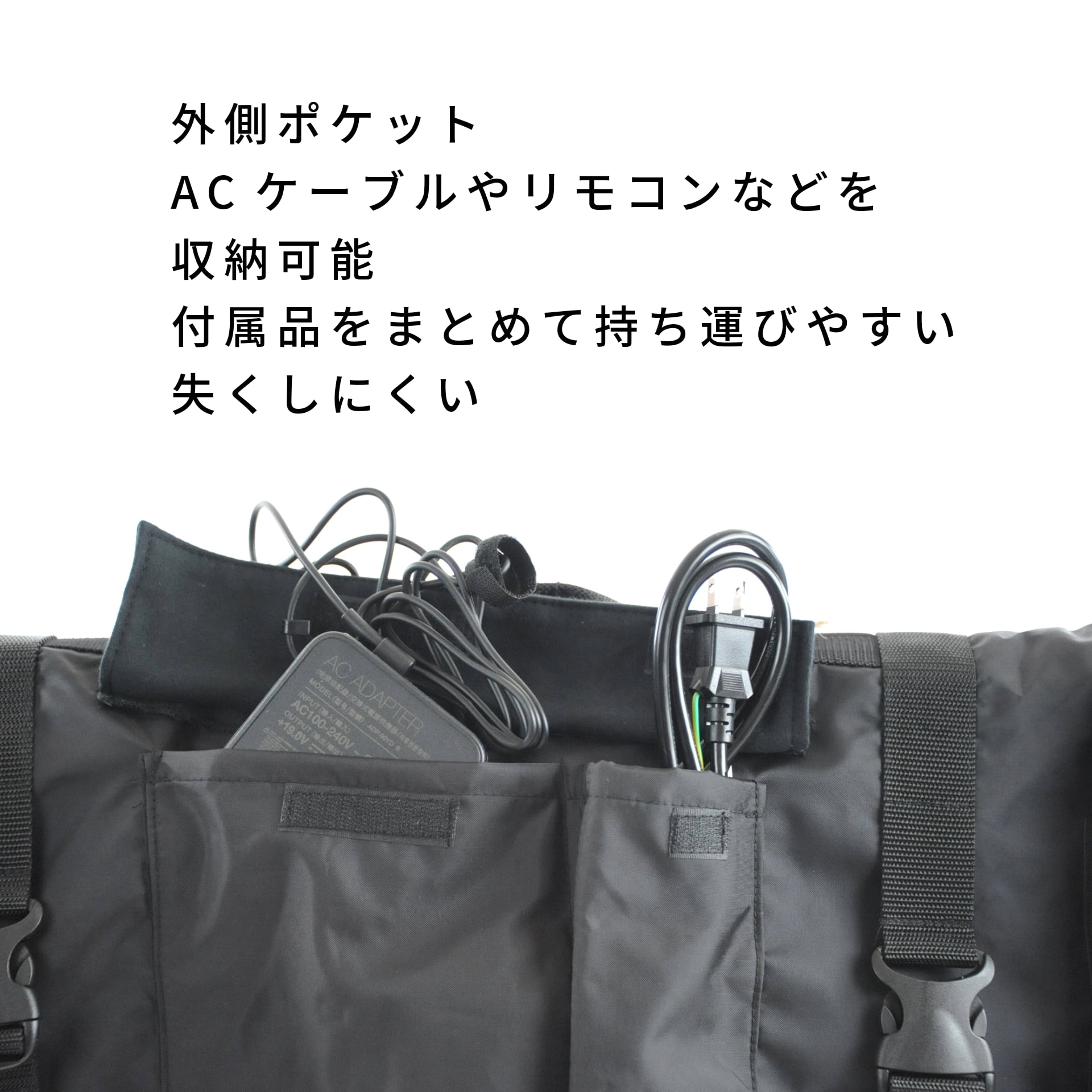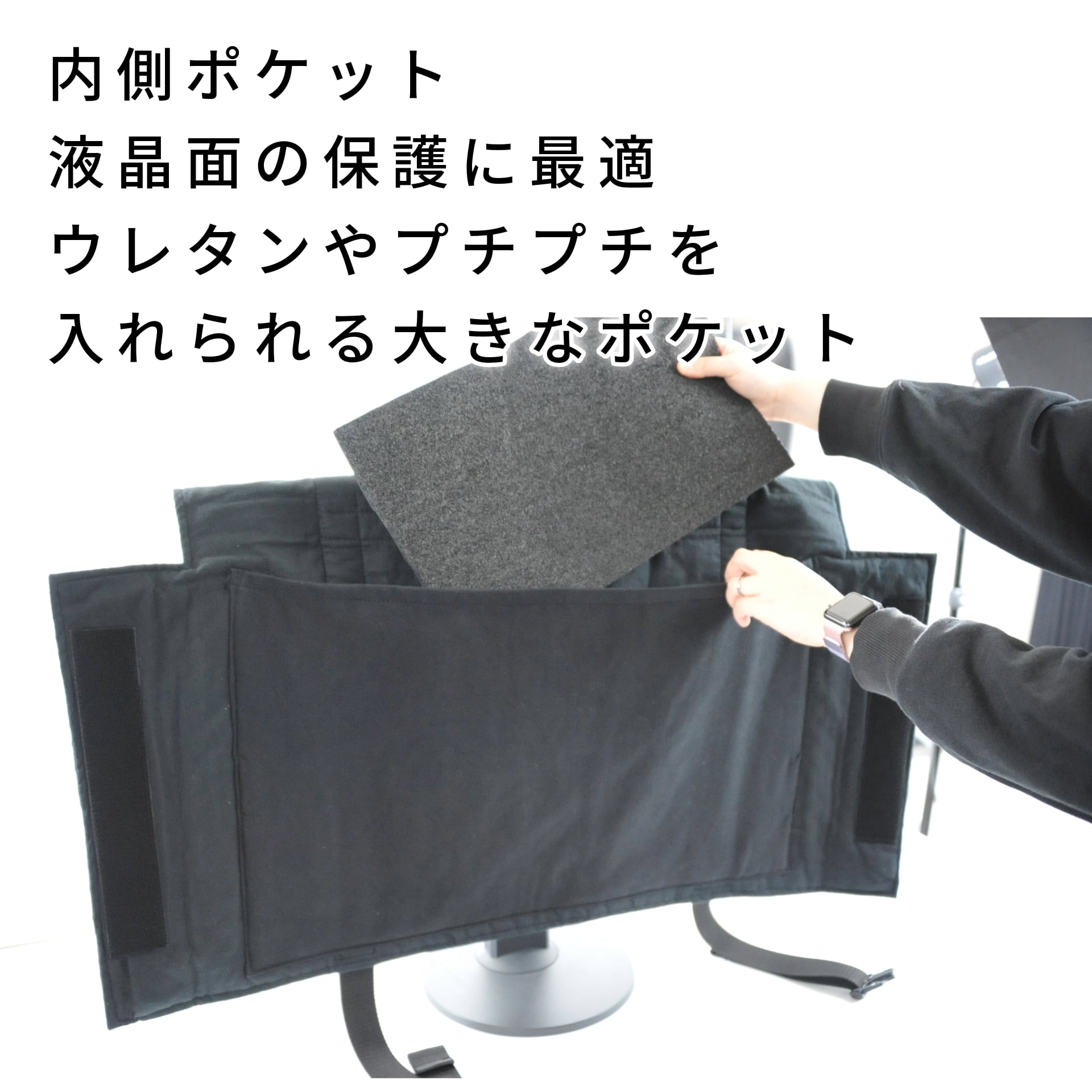 モニターを梱包する理由は、ズバリ画面を守って運搬するためです。本商品は、外布にキルティングを使用し、保護性を高めています。しかし、この商品には保護性を高めるさらなる秘密があるのです。それは、商品内側に設置された、画面と同サイズのポケットです。オプションで用意している緩衝材をそのポケットに挿入すれば、画面の保護は完璧です。