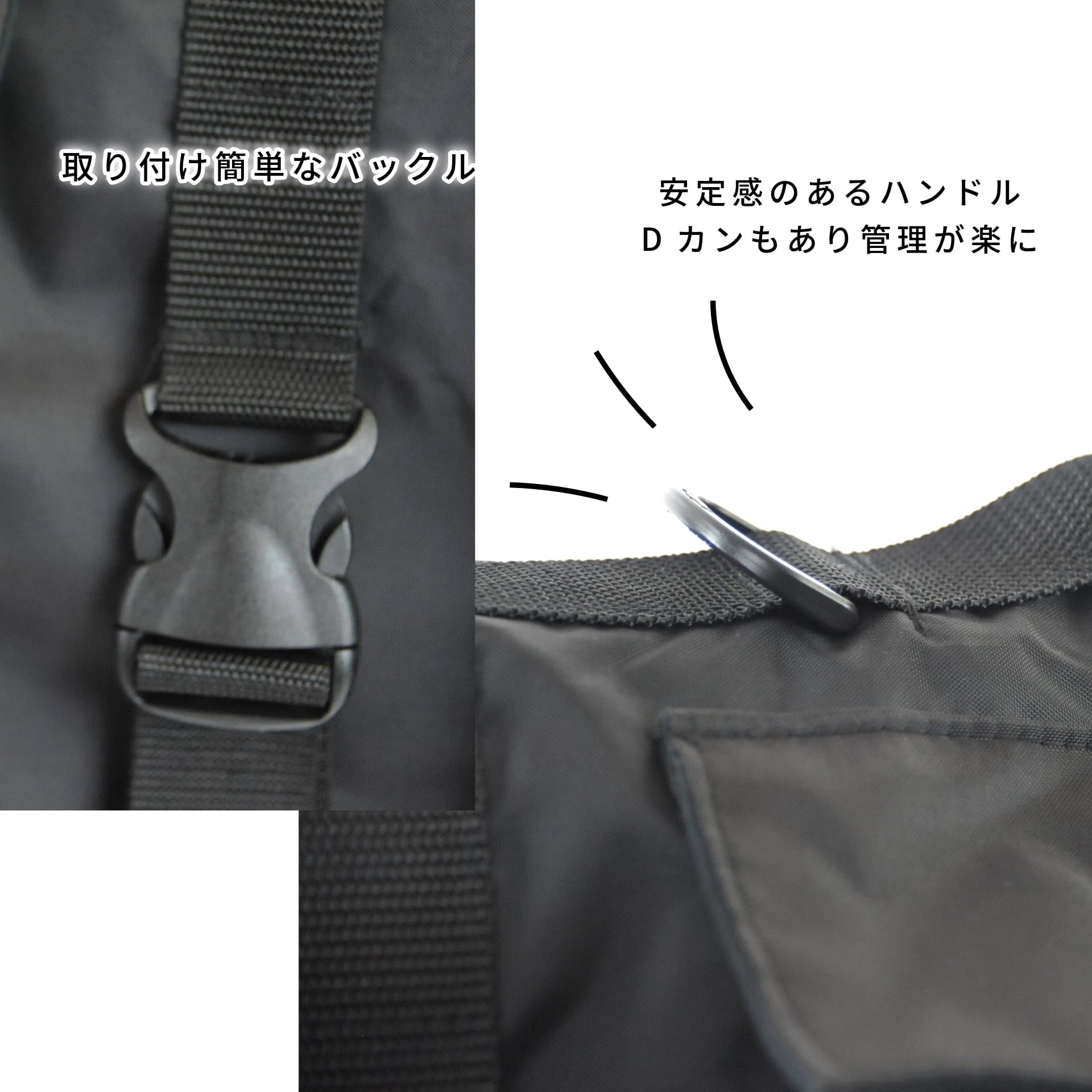 所要時間は、たったの3秒です。両脇が5cm幅のマジックテープになっているので、モニターのサイズに合わせて幅を固定することもできます。一度固定すれば、以降はマジックテープを外さなくても、脱着可能です。もちろん、収納時も被せてバックルをつけるだけの簡単作業です。