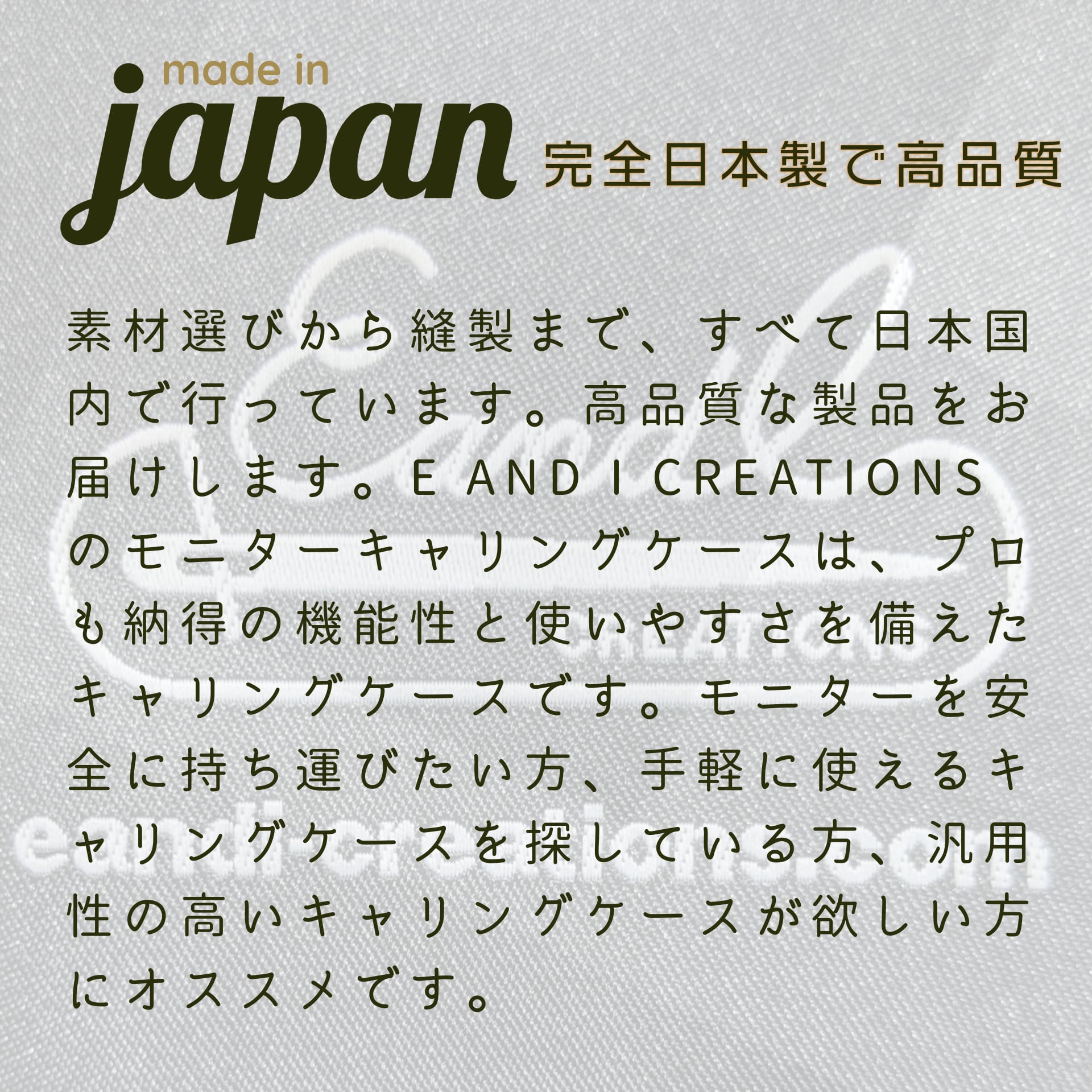 ◆Materials 表地(Outer Fabric): 100% Nylon 中生地(Interlining): 100% Polyester 裏地(Lining): 100% Cotton or 100% Polyester ◆サイズ(Size)W59×H36×D6cm ◆ケース重量(Weight) 約約480g ◆ディスプレイモニター用キャリングケースはゲーミングモニター、PCモニター、テレビモニターなどの薄型液晶モニターを安全に保護しながら運ぶことができます。 ◆各サイズのモニターケースは、1インチのゆとりは設けておりますが、できるだけモニターのインチサイズに合わせてご購入ください。 ◆映像配信現場での作業、eスポーツ、フォトグラファー、オフィスワーク、テレワーク、コワーキングスペース、展示場、公共施設、大学施設、営業活動、イベントなど、あらゆるモニターのある場所でお使いいただけます。管理や運搬、保管に最適です。 ◆表地は撥水加工、裏面にはアクリルコーティングを施したナイロンを、裏地は制電性の高いポリエステルまたは静電気に強いコットンを使用しています。モニターをホコリ、汚れから守ってくれます。 ◆耐荷重 約25~30kg(カケンセンター24時間テスト合格) ◆3つの特徴 ①ベルトで支えハンドルで持ちます。2本のベルトでバランスを取り、サイドはテープで固定化します。ハンドル脇にDカンがついています。 ②ポケットがあり、付属品をなくしません。 ③内側に画面と同じサイズのポケット付きです。ウレタンや緩衝材を入れて使用してください。 ◆【緩衝材素材(オプション)】 厚さ7mm ポリ塩化ビニール ニトリルゴム ◆湾曲モニターにも対応しています。 *21:9のウルトラワイドタイプは別売* ◆サイズはメーカーによって変わります。必ず外寸を測ってください。 *画面の外枠のサイズです(スタンドは含みません)。画面の縁取りが5cm近くあるものや、奥行きが13cm以上のものは、一つ上のインチサイズを選んでください* ◆高さ調整でスライド式になっているもの、モニター画面が縦になるものは本商品では入りきらない可能性があります。 *マチありの商品をお選びください。モニターの型番がわかる場合はお問い合わせください* ◆スタンド(足の部分)のカバーはしておりません。 *スタンドを取らないことを想定して製作しています* ◆この商品は日本国内で製産されています。 ◆Display Monitor Carrying Case Our display monitor carrying case is designed to safely protect and transport slim screens, including gaming monitors, PC monitors, and televisions. ◆Sizing Guidelines While each case size includes a 1-inch (approx. 2.5 cm) margin, we recommend selecting the size that most closely matches your monitor’s screen size. ◆Versatile Use Cases This case is perfect for video production, e-sports, photography, office work, remote work, coworking spaces, exhibitions, public facilities, universities, sales activities, and events. It is an ideal solution for organizing, transporting, and storing your equipment. ◆Premium Materials • Exterior: Water-repellent nylon with an acrylic coating. • Lining: High-performance anti-static polyester or anti-static cotton. • Protection: Guards your monitor against dust and dirt. ◆Durability • Load Capacity: Approx. 25–30 kg (Passed the 24-hour Kaken Test Center durability test). ◆Three Key Features 1. Dual-Strap Support: The case is carried by a sturdy handle, with weight balanced by two main straps and sides secured with fastening tape. Includes D-rings next to the handle for additional attachments. 2. Accessory Pockets: Integrated pockets ensure you never lose your cables or peripherals. 3. Internal Screen Pocket: Features an internal pocket the same size as the screen for inserting foam or cushioning material. ◆Optional Padding Material • Thickness: 7 mm • Material: PVC (Polyvinyl Chloride) / NBR (Nitrile Rubber) ◆Compatibility & Measuring • Curved Monitors: This case is compatible with curved monitors. ○ Note: Cases for 21:9 ultrawide monitors are sold separately. • Measure Before Purchasing: Sizes vary by manufacturer. Please ensure you measure the external dimensions of your monitor. ○ Measure the outer frame of the screen (excluding the stand). If the bezel (border) is nearly 5 cm (2 in) wide or the monitor depth exceeds 13 cm (5.1 in), please choose one size up. • Special Stands: Monitors with sliding height-adjustment stands or those positioned vertically may not fit this standard case. ○ Please select a model with a gusset (extra depth). If you have your monitor's model number, feel free to contact us for assistance. • Stand Coverage: This product does not cover the stand (base). ○ It is designed to be used without removing the stand. ◆Made in Japan