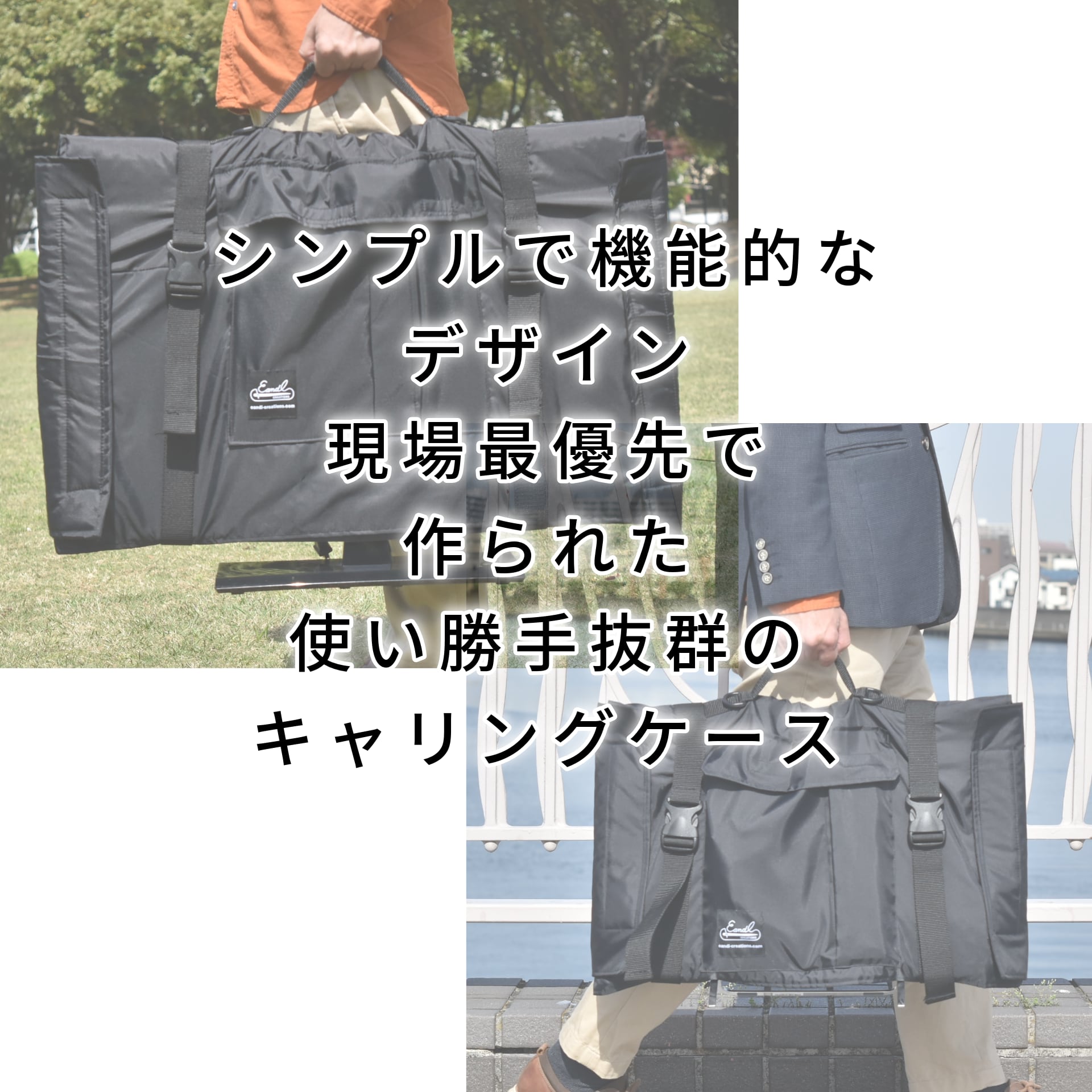 本商品は、通常のバッグのように持ち手を持って運ぶことが可能です。持ち手の両端からは、モニターを支えるように2本のベルトを配置し、重量バランスを調整できるようになっています。持ち手には重量に耐えられるように芯が入っており、縫製もしっかりと行っているので安心です。